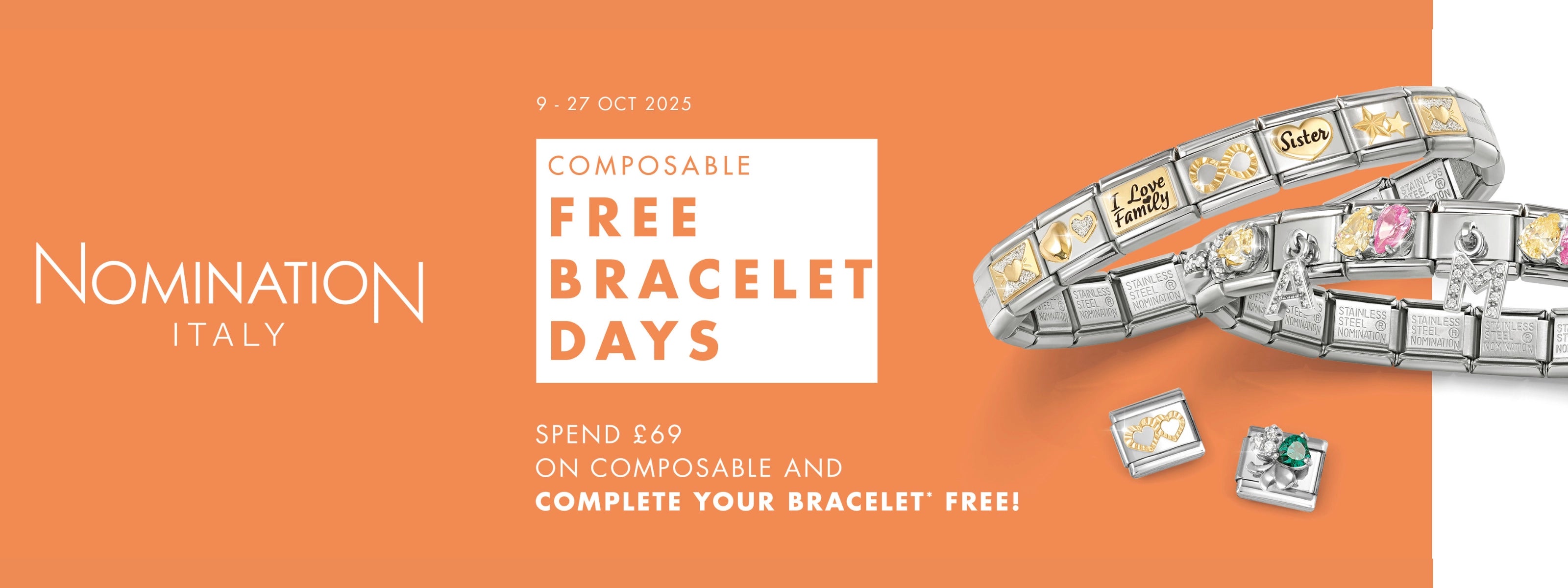 Spend £69 on Nomination Charms, Get a Charm Bracelet Free.