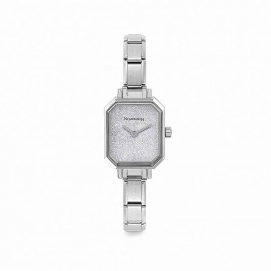 Time Rectangle Silver Glitter Dial & Silver Charm Bracelet Watch