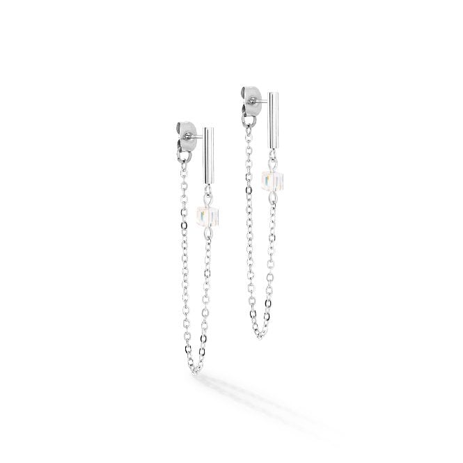 Enhance your look with the Mini Cubes & Chain Earrings, a sophisticated design from the award-winning brand. These Coeur de Lion Earrings feature polished stainless steel with a radiant silver-toned finish and clear white elements. A delicate, long chain is adorned with sparkling Swarovski® Crystals, providing a captivating shimmer. Measuring 5 cm in length, they offer a stylish and elegant statement. Perfect for adding refined sparkle to any occasion.