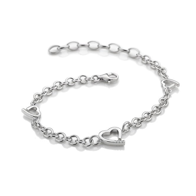 From the Most Loved Collection, you can feel the warmth of love when you wear one of these lovely Hot Diamonds bracelets. Three modern highly-polished hearts crafted in sterling silver adorn the open link bracelet. One heart is graced with three zirconia crystal stones and a single genuine diamond. This Warm Heart Bracelet from Hot Diamonds is an an adjustable chain measuring 18-24 cm.