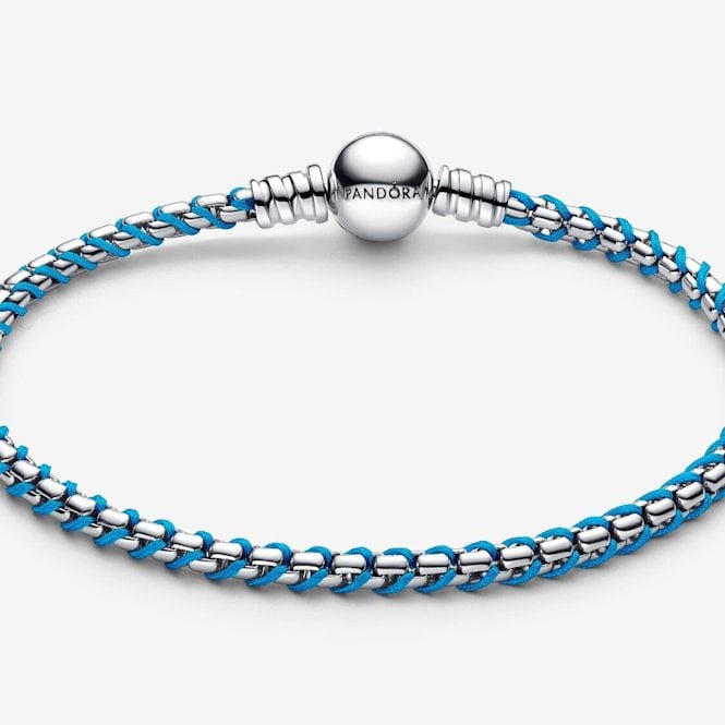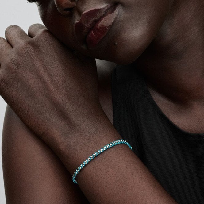 Add a pop of colour to your wrist with our Blue Cord Snake Chain Bracelet. This 16 cm bracelet from our Pandora Moments Collection combines a braided sterling silver chain with a cool, summery turquoise textile cord. It's a great way to mix textures and add something a little bit different to your usual summertime look. Wear it on its own for a subtle statement or load it up with your favourite Pandora Moments charms.