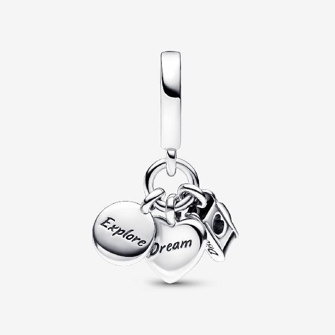 A Pandora Pendant Charm for dreamers and explorers, this Camera, Heart & Compass Triple Dangle Charm carries your favourite travel memories with you in your treasured jewellery. This trio of sterling silver dangles features a camera with a sparkling zirconia stone as the lens. It also features a heart-shaped world map with blue and green gradient enamel and a compass with a fixed orientation arrow. "Discover", "Dream" and "Explore" are engraved on the backs of the dangles. Style it together with your favourite Pandora charms from your travels as a reminder to always keep exploring.