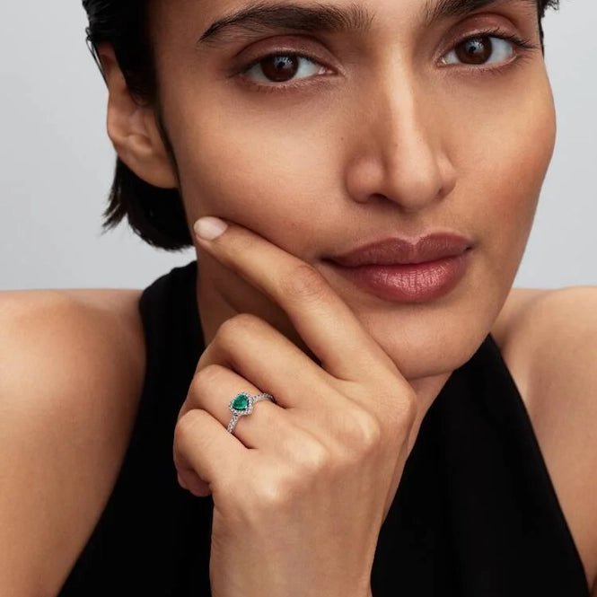 The Elevated Royal Green Heart Ring, here in a size 56, is a Pandora ring built around a central heart-shaped imitation crystal in a rich royal green. The stone is elevated above a sterling silver band to maximise light exposure and sits within a halo of clear-white brilliant-cut zirconia crystal stones. The 925 sterling silver shank is half-embellished with pavé-set stones, providing a continuous multi-faceted contrast against the polished metal.