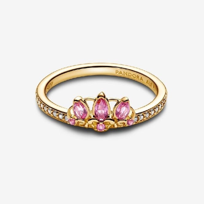 Channel your inner princess with one of these size 50 Disney Princess Rapunzel Tiara Rings from Pandora. This enchanting 14kt gold-plated ring captures Rapunzel's adventurous spirit and courageous heart. Three pink pear-shaped crystal stones shimmer amidst swirling openwork details, while clear-white pave sparkles along the slim stackable band. Wear these Pandora Rings to serve as a reminder to embrace your dreams and embark on your own exciting adventures.