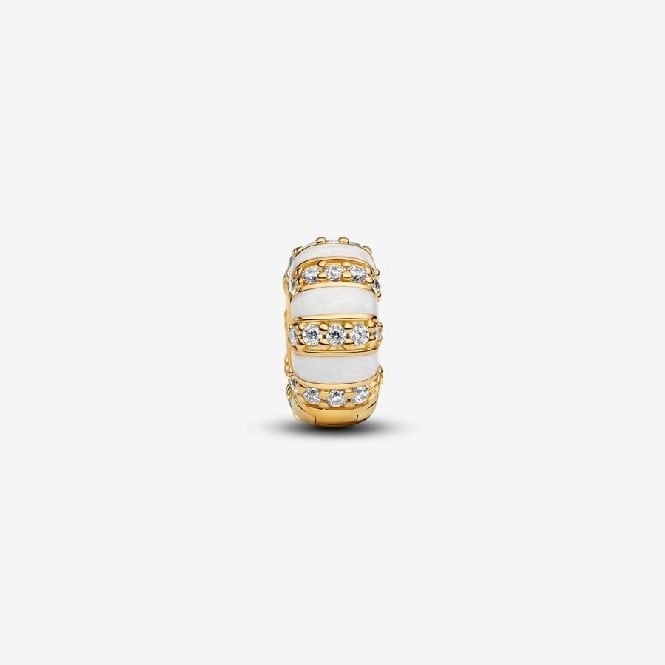 Add a radiant glow to your style with our Stones & Enamel Clip Charm. This 14kt gold-plated piece features alternating lines of dazzling zirconia crystal stones and smooth white enamel, creating a striking contrast against the gold-plated setting. The silicone grips inside these Pandora clip charms ensures they stay securely in place. The design, with its blend of sparkle and shine, represents inner strength and beauty, reflecting the endless potential within you, just like the clip itself.
