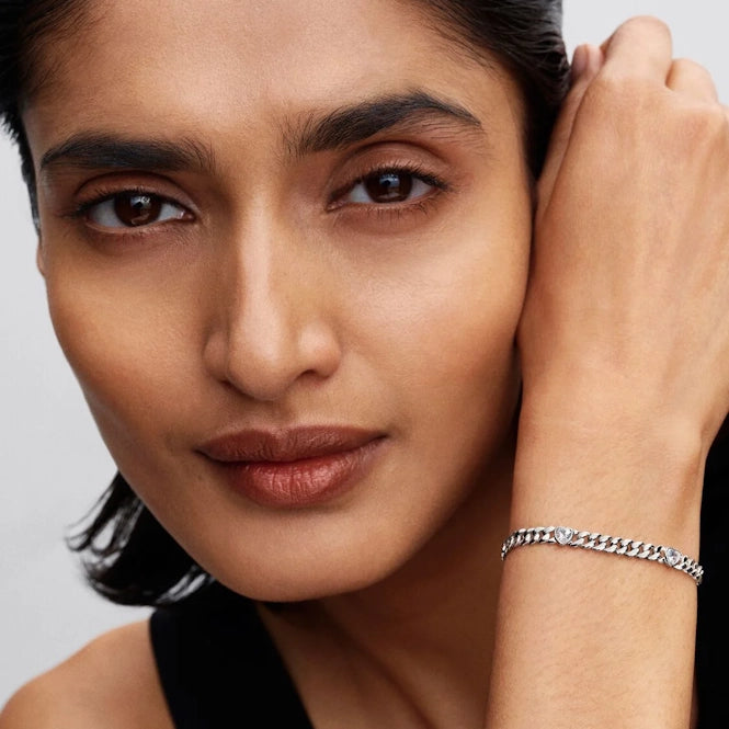 Celebrate love with this elegant 18 cm length Heart Cuban Chain Bracelet. This stylish piece is crafted from polished sterling silver and features a classic Cuban link chain. Along the bracelet, shimmering heart-shaped zirconia crystal stones are set at intervals, creating a beautiful contrast with the bold links. Wear this Pandora Cuban Chain Bracelet as a timeless symbol of elegance and affection.