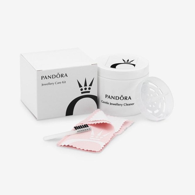 This is the official cleaning kit to maintain the glorious shine of your Pandora charms and jewellery with handy instructions for support. This jewellery cleaner set features a brand-approved cleaning solution for the materials Pandora uses in their items, a handling tray and a soft cleaning brush, and also a double-sided polishing cloth. The cloth has a white side, especially for sterling silver and 14kt yellow gold, and a pink-coloured side for brightening the plated metals such as the pink-plated Pandora Rose and the yellow-gold toned Pandora Shine.