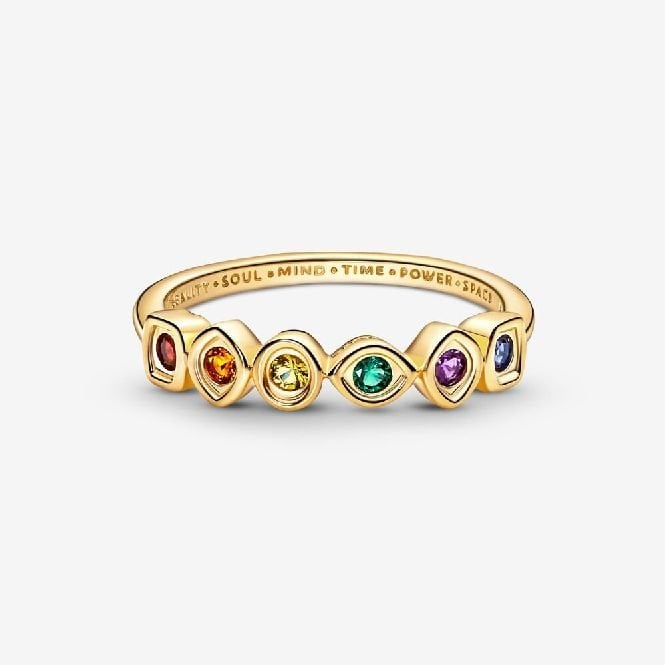 From the Marvel x Pandora collection, in ring size 54, you can harness the power of the Infinity Stones with Marvel The Avengers Infinity Stones Ring. It is perfectly balanced, as all things should be. This 14kt yellow gold-plated ring features six colourful imitation crystal stones symbolising the most prized objects in the cosmos. The inside of the band is engraved with each stone's interconnected power: space, reality, power, soul, mind and time. Pair these Pandora Rings with other battle-ready pieces from the exclusive range.
