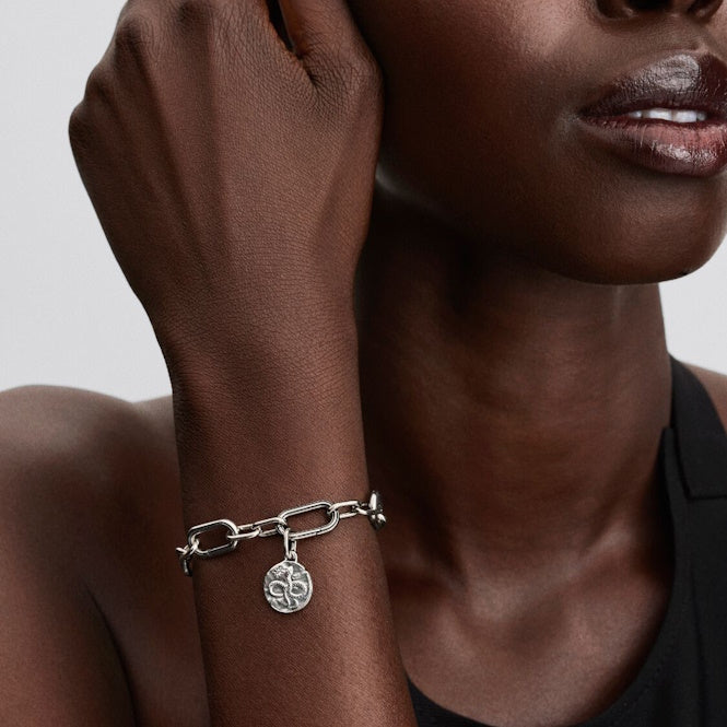 Enhance your Pandora ME collection with the Infinity Snake Medallion Charm. This hand-finished piece is crafted from sterling silver with a textured finish, giving it a stylishly aged look. The front of the medallion features a beautifully detailed snake coiled in the shape of an infinity symbol, representing endless possibilities and transformation. On the reverse side, the Latin phrase "MEMENTO VIVERE" is engraved, which translates to "remember to live." A powerful message which can serve as a reminder to cherish every moment and embrace new beginnings.