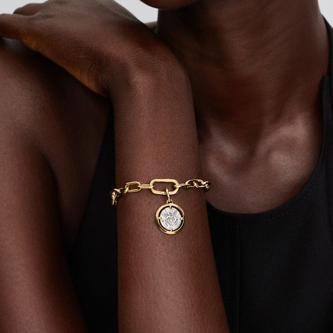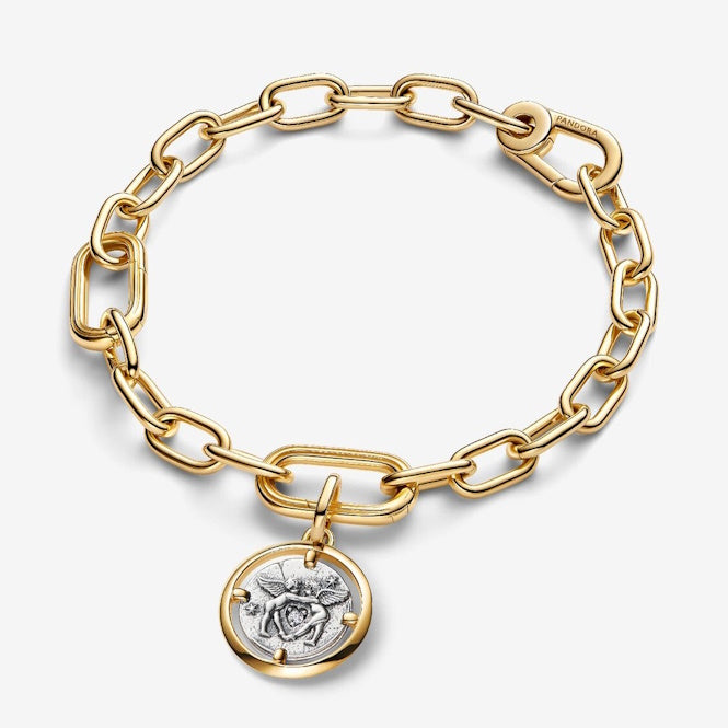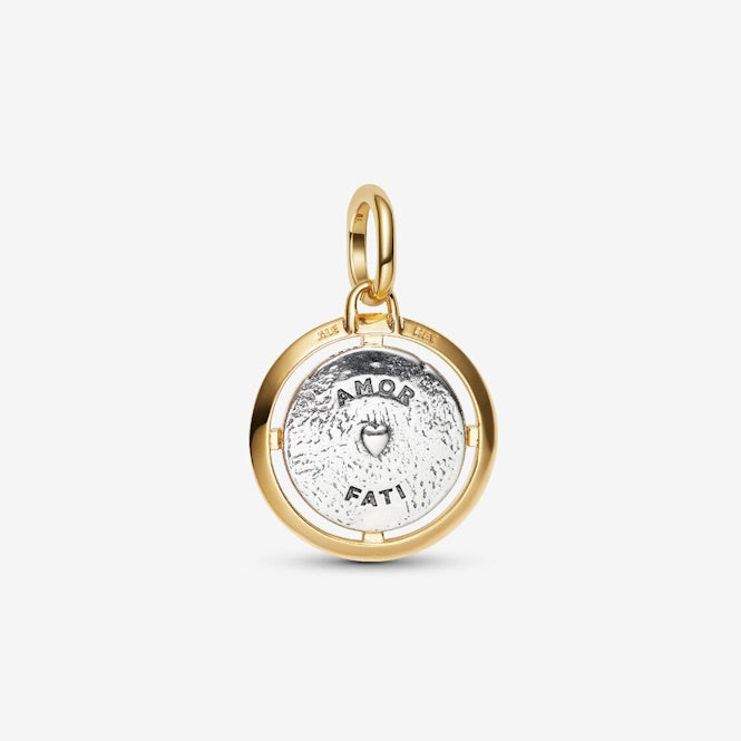 Elevate your jewellery collection with the Pandora Cupids Medallion Charm. This unique medallion features a central sterling silver disc within a 14kt gold-plated frame. The front of the disc shows a detailed image of two winged cupids embracing a heart, a timeless symbol of love. On the reverse side, the Latin phrase "AMOR FATI" is engraved, which translates to "love of fate." A powerful message serving as a reminder to embrace life's journey, making the pendant a personal and meaningful piece. These versatile charms can be worn on bracelets or necklaces, adding a sophisticated yet playful element to anyone's look.
