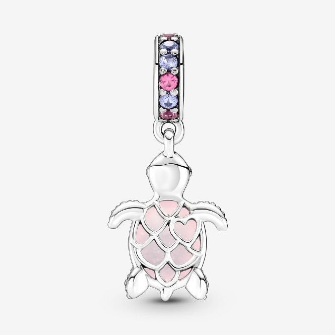 Pandora's lovely sea turtle charm is being taken one step further with the addition of a new friend in bright frosted pink. There are pink and purple man-made crystal stones on the bail of this silver Pandora pendant charm and frosted Murano glass as its shell, which glitters with the light thanks to the flecks patterned on top. There is a sterling silver cut-out pattern in the belly of the sea turtle. There is a heart off centre in the sterling silver pattern, giving it the appearance of scales. Carry this and more of your Pandora turtle friends on your Moments bracelet or pendant charm holder.
