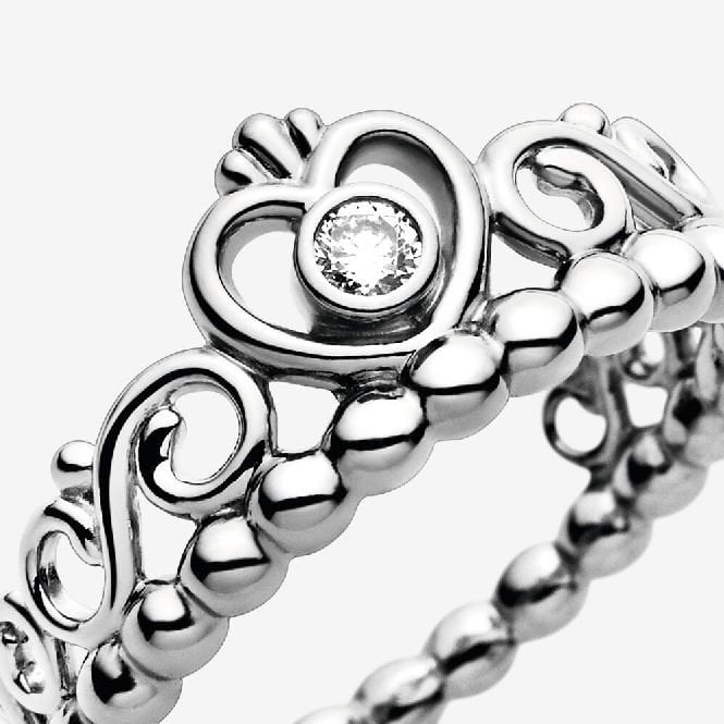 This magnificent Pandora Princess Tiara Crown Ring in a size 56 will make you feel like a princess every day of the week. Sterling silver is exquisitely crafted into this stunning design, which provides a heart-shaped tiara design adorned with a shimmering zirconia stone. It can be showcased on its own, or you can pair it with other Princess rings to complete the fairytale look.