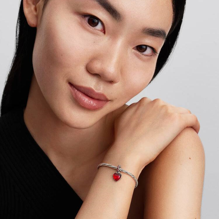 Make a romantic statement with the Red Murano Glass Heart Double Dangle Charm. Expertly hand-finished in sterling silver, this emotive piece showcases a heart crafted from vivid red Murano glass. The design features the handwritten inscription, "You are my soulmate" across the front, making it a clear declaration of one's affection. To enhance the rich colour palette, the bail is detailed with sparkling red imitation crystal stones that shimmer in the light. Whether you are marking an anniversary or simply celebrating your partner, this Pandora charm adds a meaningful sentiment to any bracelet styling.